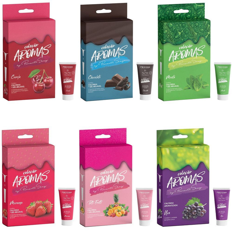 Coleção Aromas, são 6 modelos de caixinhas e sabores diferentes sendo eles: cereja, chocolate, menta, morango, tutti-frutti e uva.