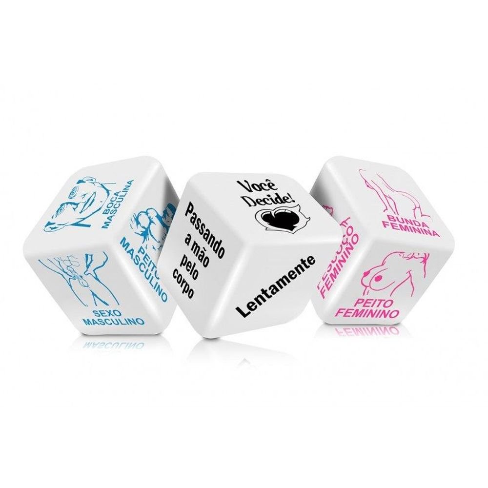 Os Dados são jogos para adultos. Os cubos contém posições sexuais, ações, locais, dentre outras opções… Para você tornar o momento a dois muito mais divertido e criativo! Ele joga com o dado as partes femininas e ela com o dado com as partes masculinas, alternadamente junto com o dado de tarefas.
