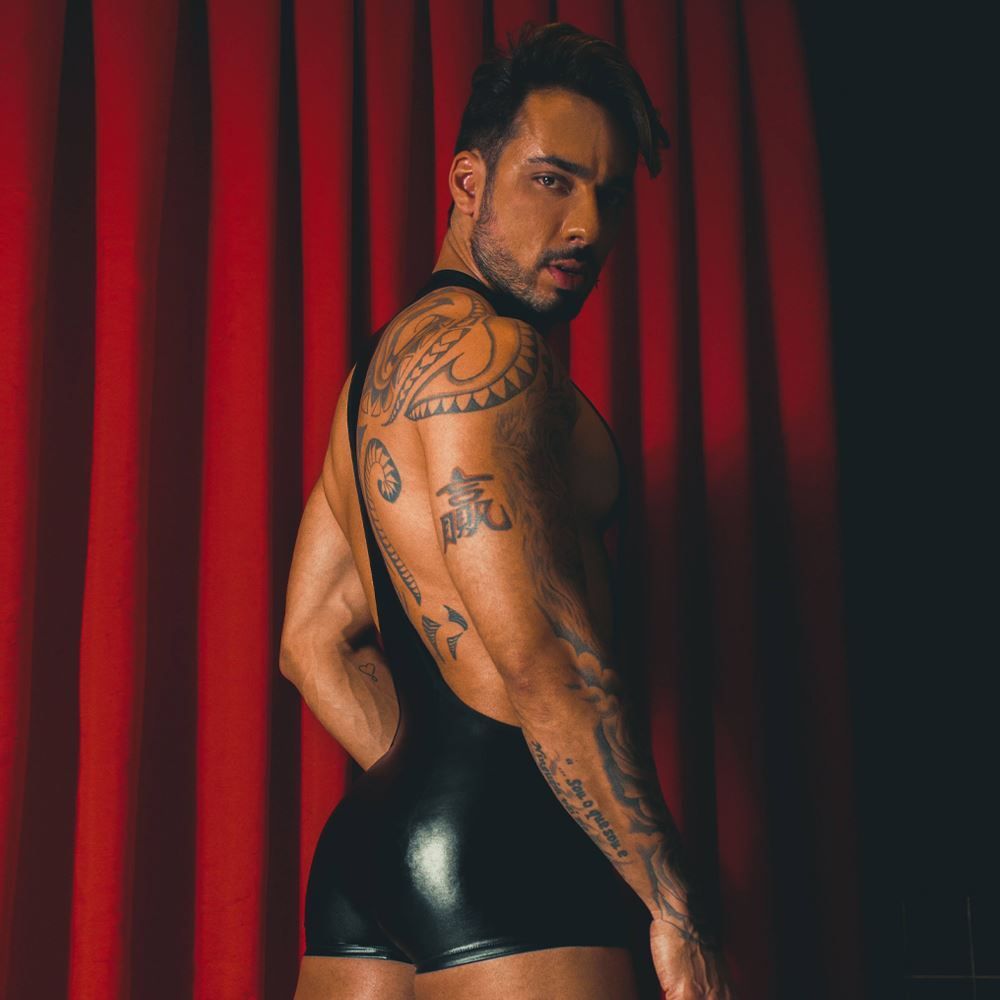 Fantasia feita em Vinil, com recortes na frente, peça sensual e elegante.