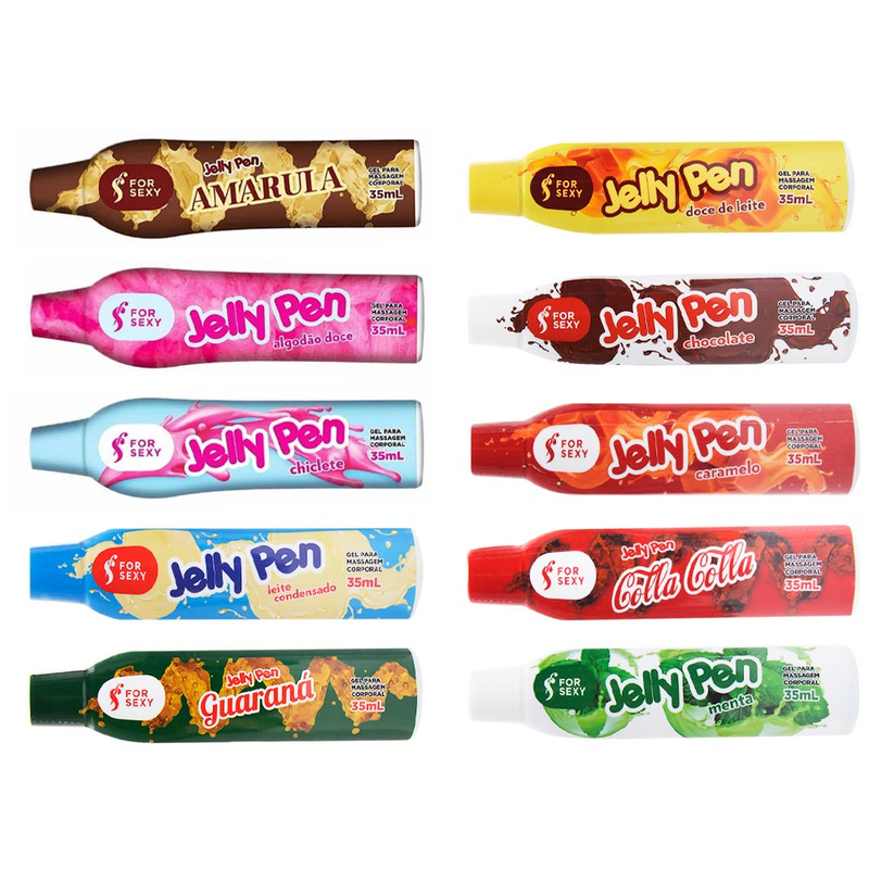 A Caneta Gel Jelly Pen 35ml possui diversas opções deliciosas: algodão doce , amarula, caramelo, chiclete, chocolate, coca cola, doce de leite, guaraná, leite condensado e menta.