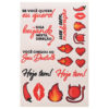 Uma cartela de Tatuagens temporárias. Foram pensadas pra quem quer despertar seu desejo e apimentar ainda mais os momentos de prazer. Com aroma afrodisíaco de Baunilha, podem e devem ser usadas em lugares estratégicos para aumentar o tesão através dos sentidos visual e olfativo.
