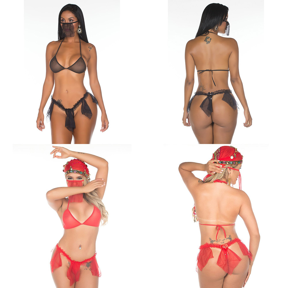 Contém: 1 Saia com fio dental; 1 Top de amarrar; 1 véu boca.