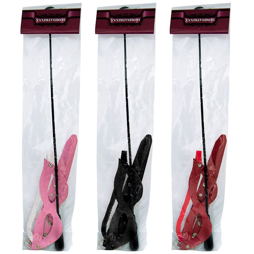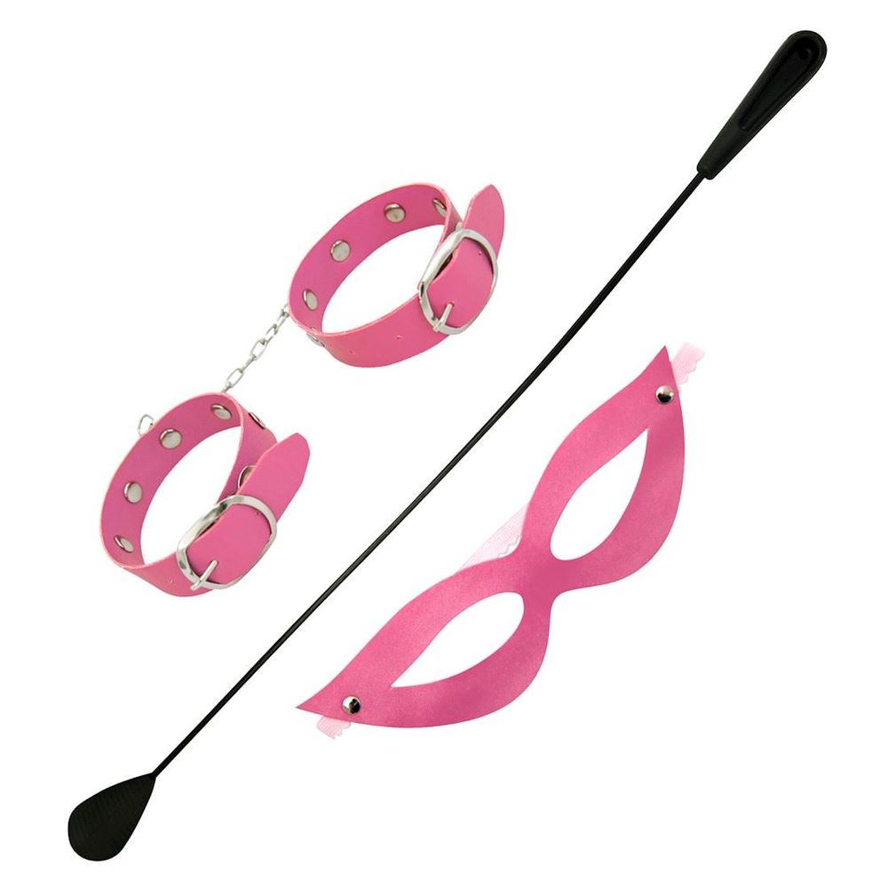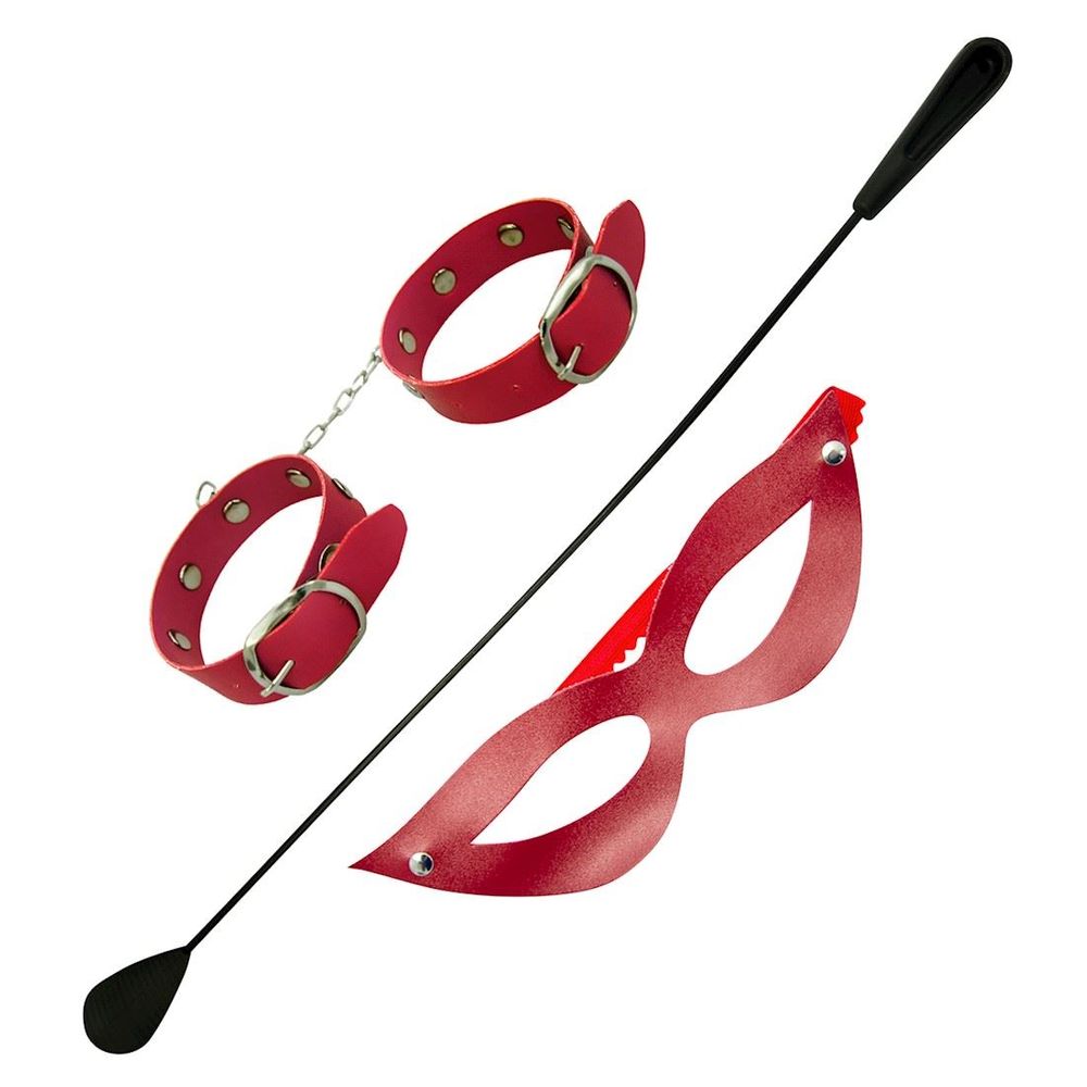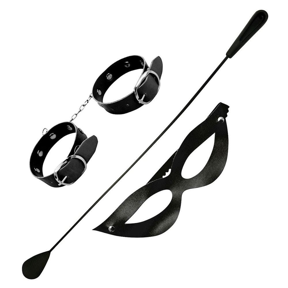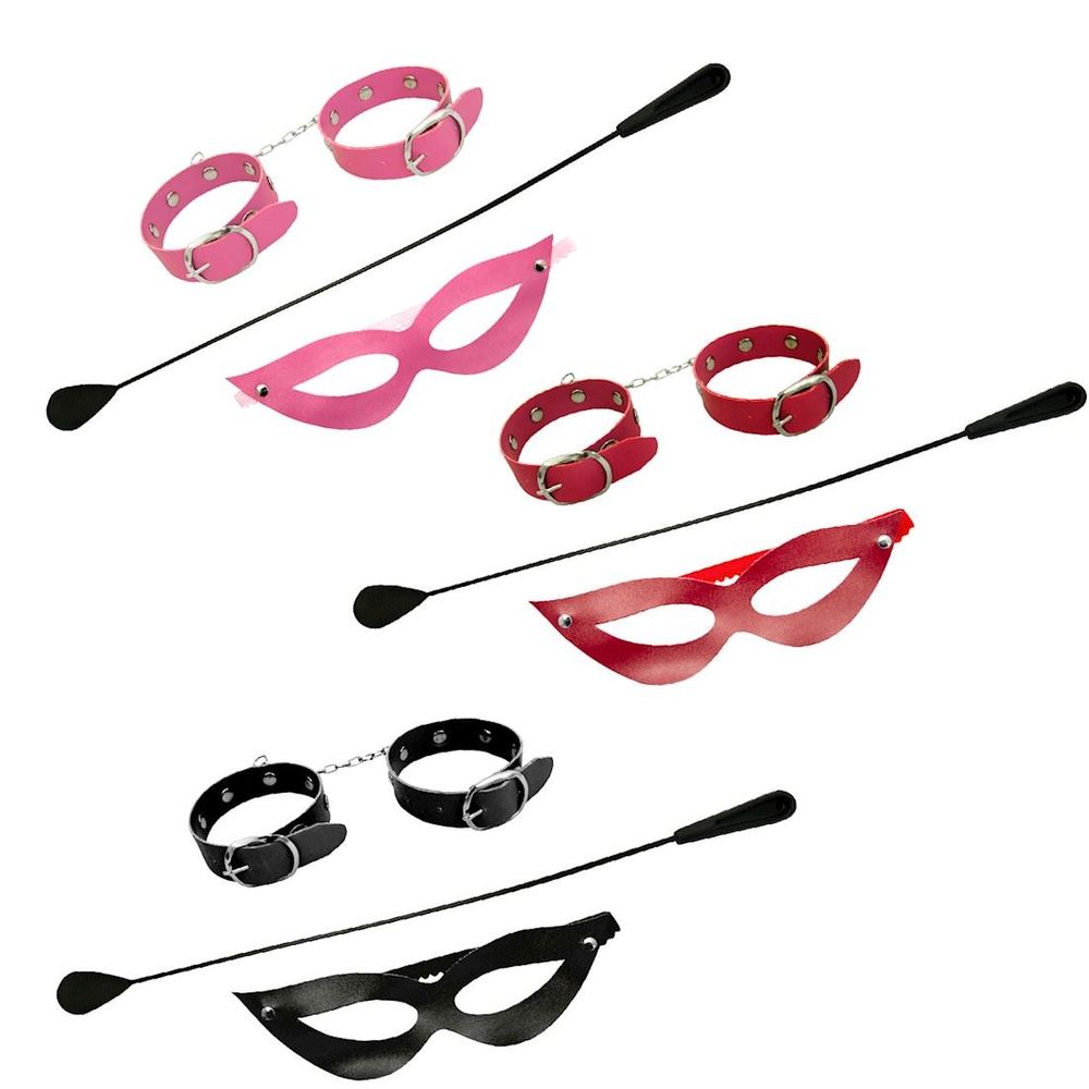 Kit Tiazinha Trio com chibata, máscara e algema bracelete fina. Confeccionada em couro sintético liso. Chibata flexível e algema também em couro sintético com fecho em metal.